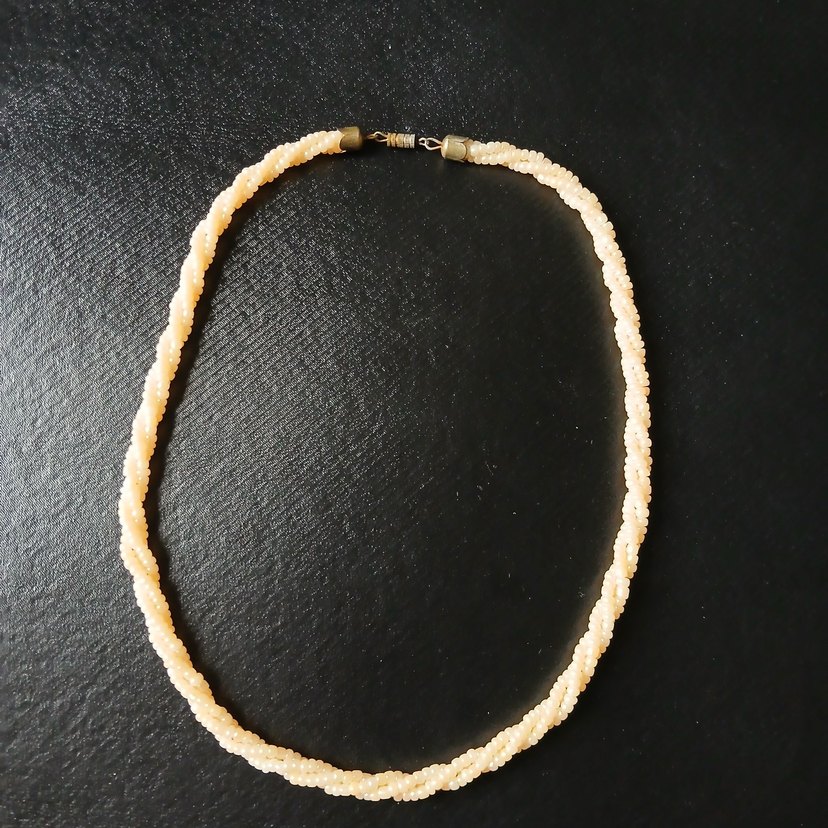 Bej renkte, parlak görünümlü boncuklardan oluşan midi boyda, bohem tarzda günlük kullanım için uygun kolye. ✨