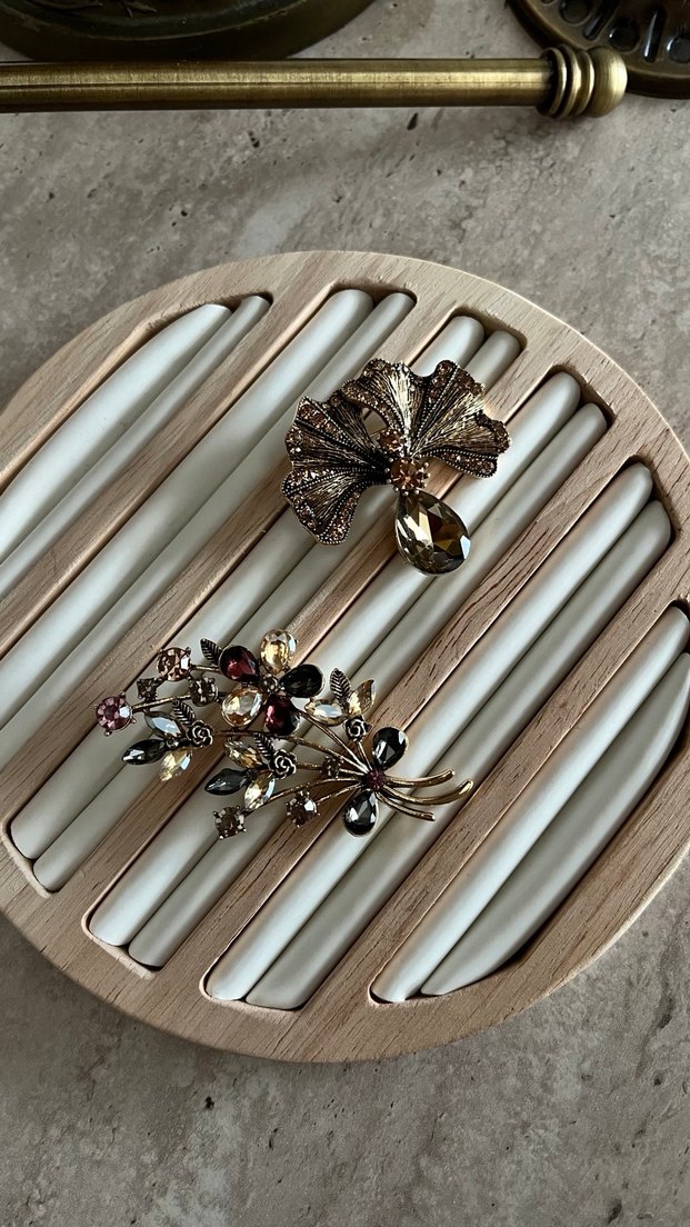 Bej tonlarda boncuk işlemeli, çiçek desenli broşlar. Bohem ve vintage tarzı yansıtır. Düğün ve retro kombinlere uygundur.