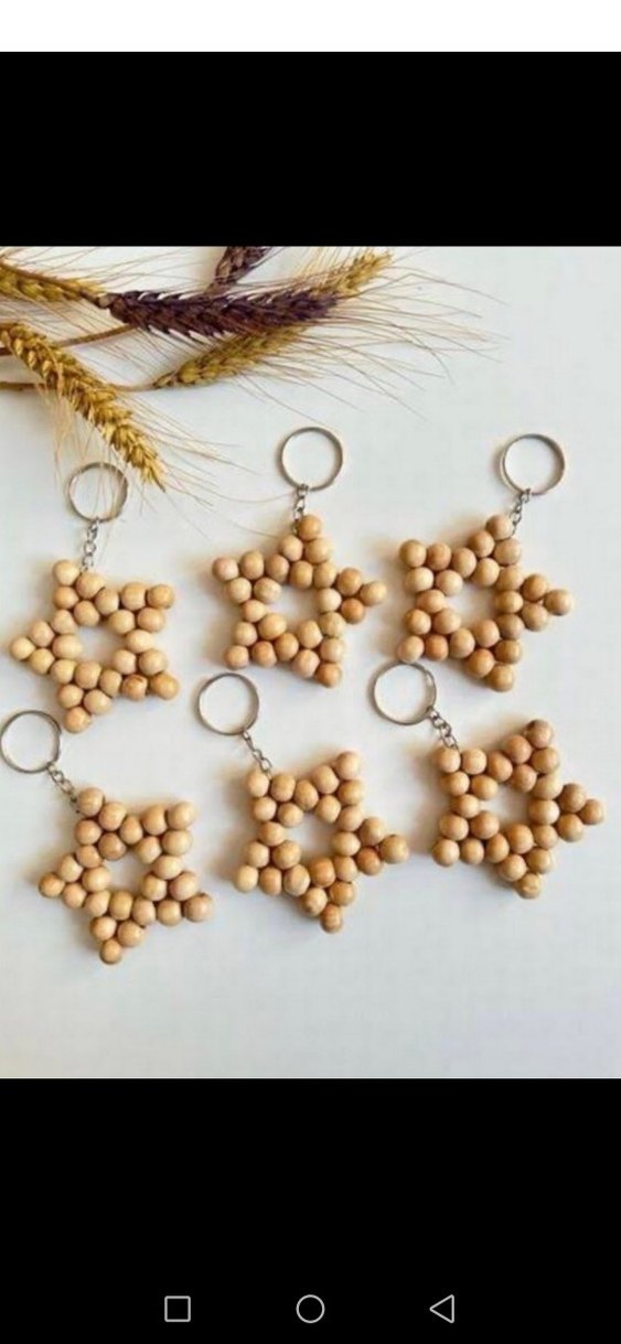 Bej boncuklardan yapılmış yıldız şeklinde anahtarlıklar, bohem ve minimalist tarzda. Hafif ve dekoratif, günlük kullanım için uygun.