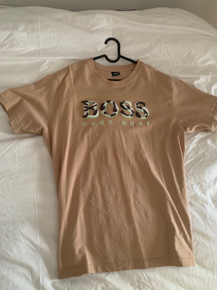 Bej renkte, kısa kollu, yuvarlak yaka BOSS baskılı erkek tişört. Yumuşak sentetik kumaştan, rahat kesim ve pastel tonlarda, günlük sokak stili için uygun.