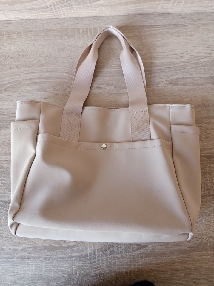 Bej renkli, yumuşak sentetik kumaştan desen içermeyen kadın el çantası. Günlük kullanıma uygun. Sadece küçük lekeler var bazı yerlerinde ama bir iki yıkamada geçer.