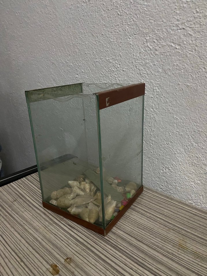 Küçük boyutta, bej renkli camdan yapılmış akvaryum içinde biraz yatak malzemesi bulunur.