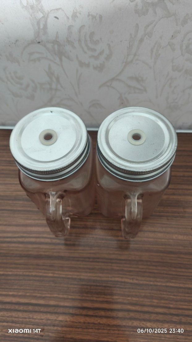 İki adet kulplu bej cam kavanoz, gri kapaklı ve ortasında delik bulunan tasarım. Sıvı veya kuru gıdalar için uygundur.