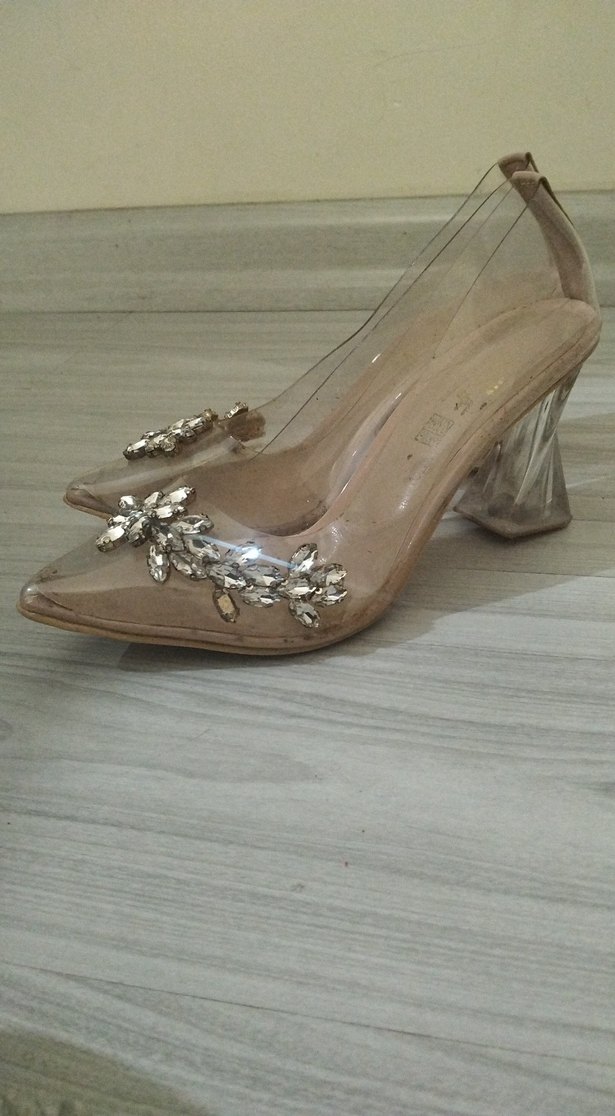 Bej Cam Topuklu İşlemeli Abiye Ayakkabı