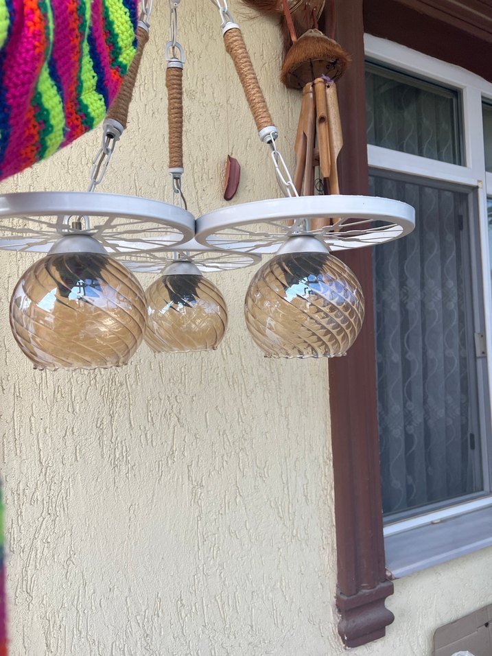 Bej renkte cam küreler ve ahşap detaylı, açık bej çerçeveli doğal ve sıcak görünümlü avize.