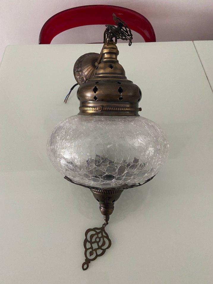 Bej antika metal çerçeve ve çatlak cam şapka ile duvara monte edilen vintage tarzda lamba. Dekoratif metal detaylara sahiptir. 1 tanesi Orta boy, 1 tanesi büyük boydur. İyi durumdadır.