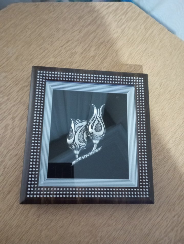 Karanlık arka plan üzerinde bej renkli çerçeve ve ortasında gümüş renkli çiçek tasarımı bulunan tablo. Çerçeve kenarlarında noktalı desen yer alır.