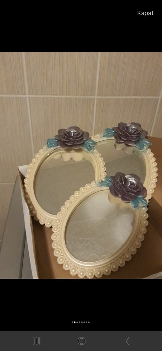 Bej çerçeveli oval aynalar, mor gül ve mavi yaprak detaylarıyla süslenmiştir. Her mekana zarif bir dokunuş katar.