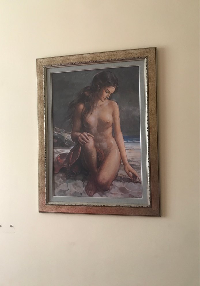 Parlak bej çerçeveli bu tabloda, deniz kenarında oturan çıplak bir kadın figürü yer alıyor. Detaylı insan formu ve yumuşak renkler ön planda.