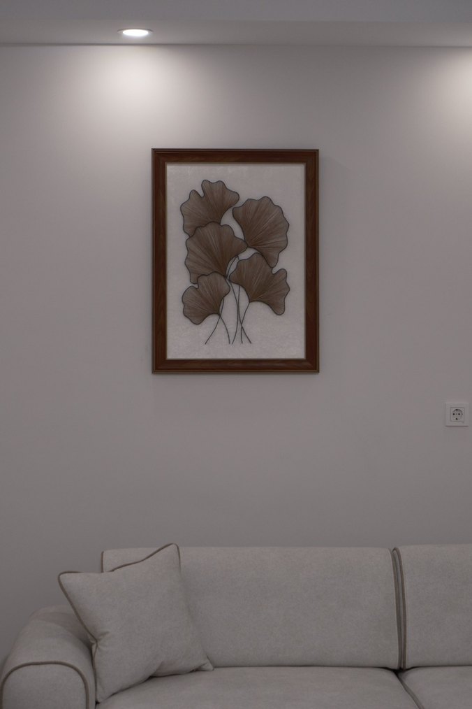 Açık zemin üzerinde yaprak figürlü, bej çerçeveli tablo, odanıza zarif bir dokunuş katar.