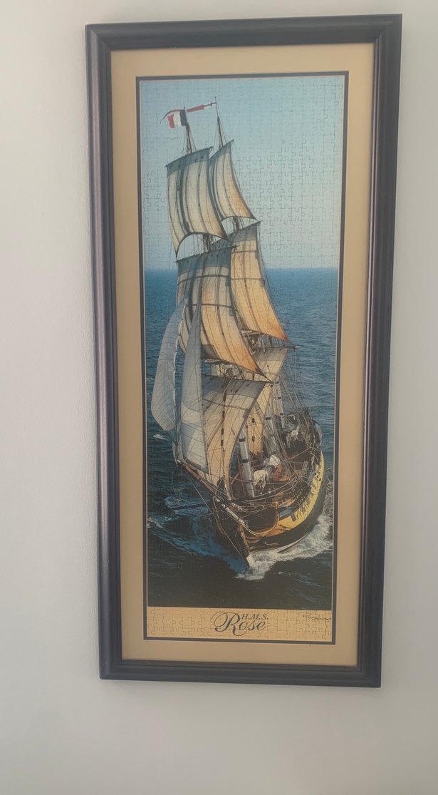Bej tonlarda ve koyu kontrastlı, "H.M.S. Rose" adlı yelkenli gemi tablosu ve çerçevesi. ⛵1000 parça yapılmış çerçeveli puzzle