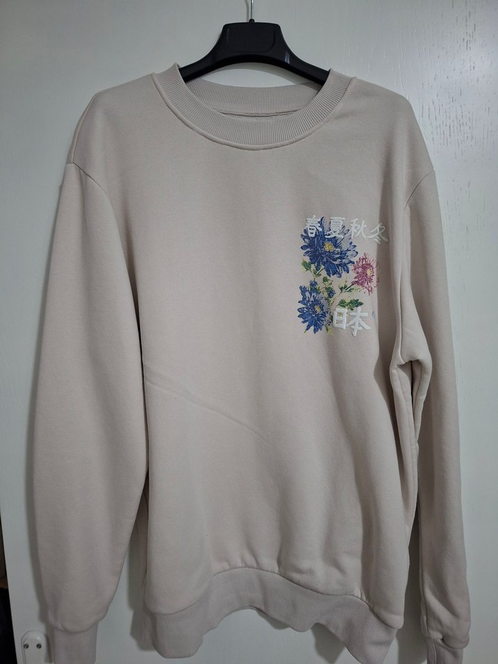 Bej renkte, yuvarlak yakalı ve uzun kollu, bol kesim erkek sweatshirt. Yumuşak kumaştan, çiçek baskılı, rahat kullanım için uygundur.