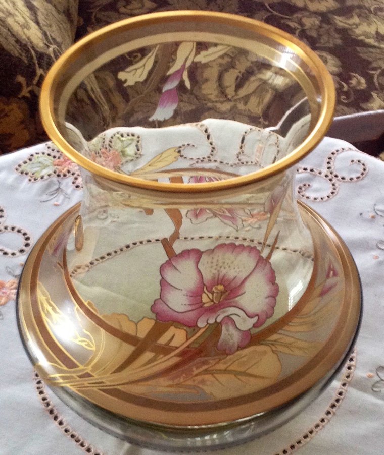 Bej renginde, altın yaldızlı kenarları ve zarif çiçek desenleriyle lüks ve şık bir vazo.