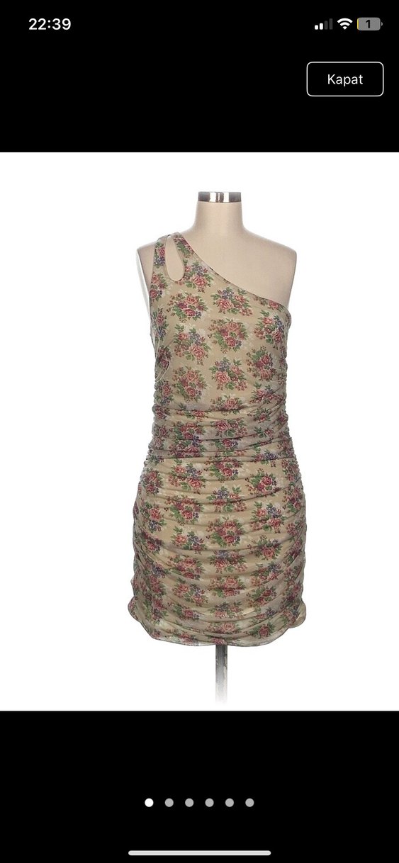 Bej renk, çiçek desenli, askısız midi elbise. Drapeli ve fitted kesim, sentetik kumaştan, bohem tarzda, parti için uygun.