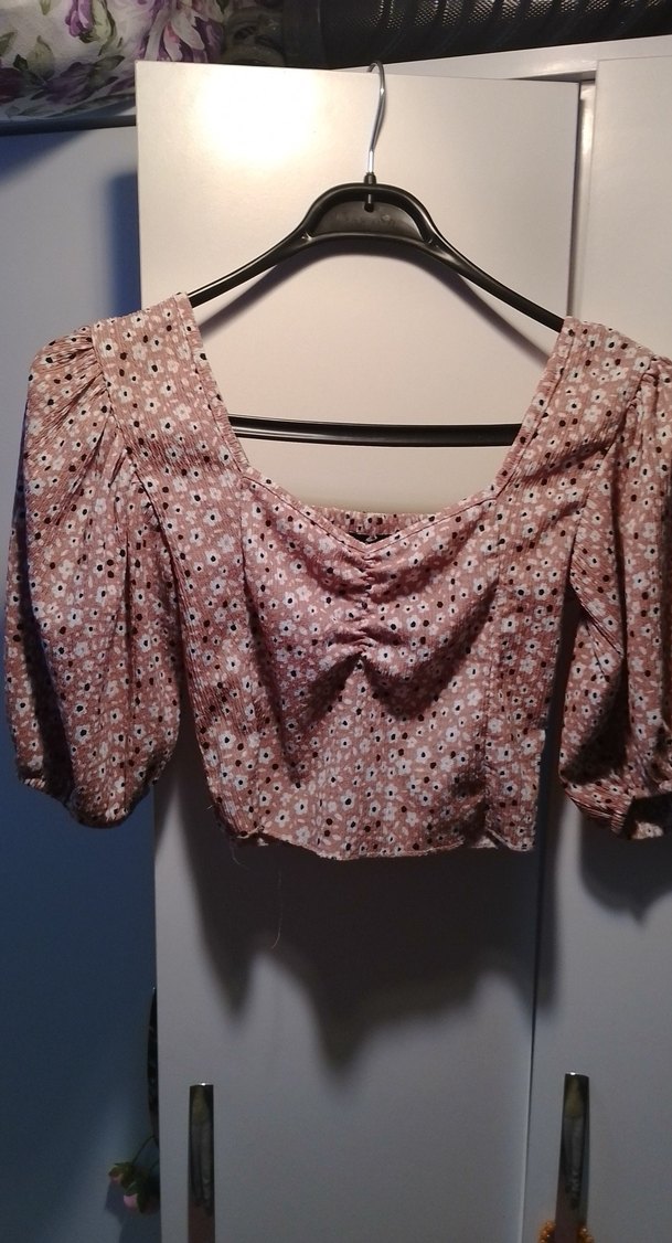 Bohem tarzda, bej pastel tonlarda, çiçek ve batik desenli, düğmeli, kısa ve bol kesim kadın bluz.en son resimde dikiş söküğü vardır