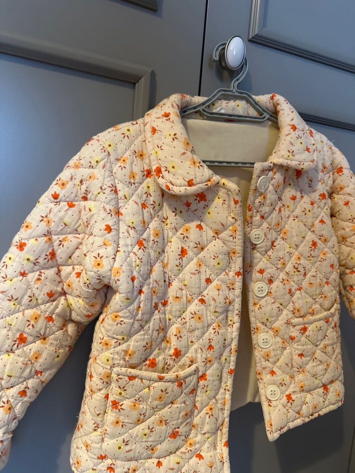 Bej renkli, düğmeli ve yakalı, pastel çiçek desenli bohem tarzda kapitone kız mont. Rahat kalıp ve ön cepler içerir.