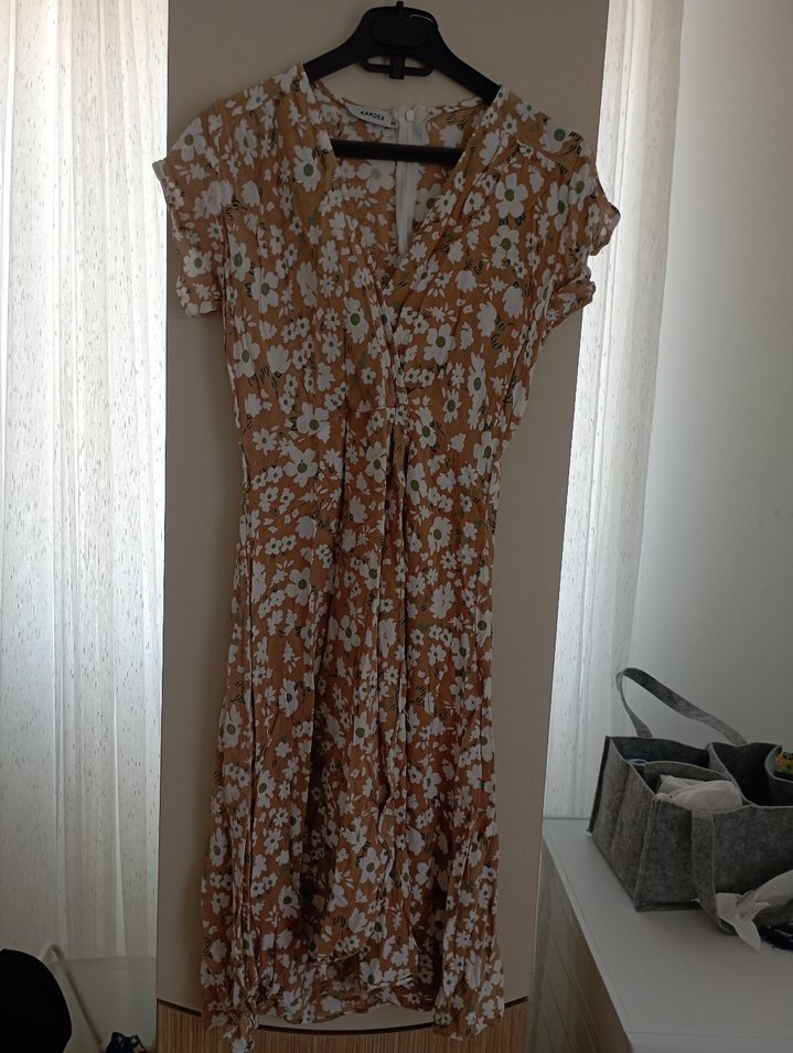 Sentetik kumaştan yapılmış, kısa kollu, V yakalı, çiçek desenli ve drapeli bej midi elbise.