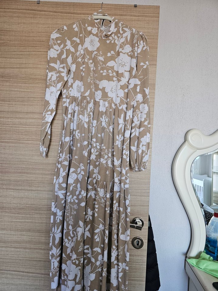 Bej renkte, beyaz çiçek desenli, bol kesim, yüksek yakalı uzun elbise.