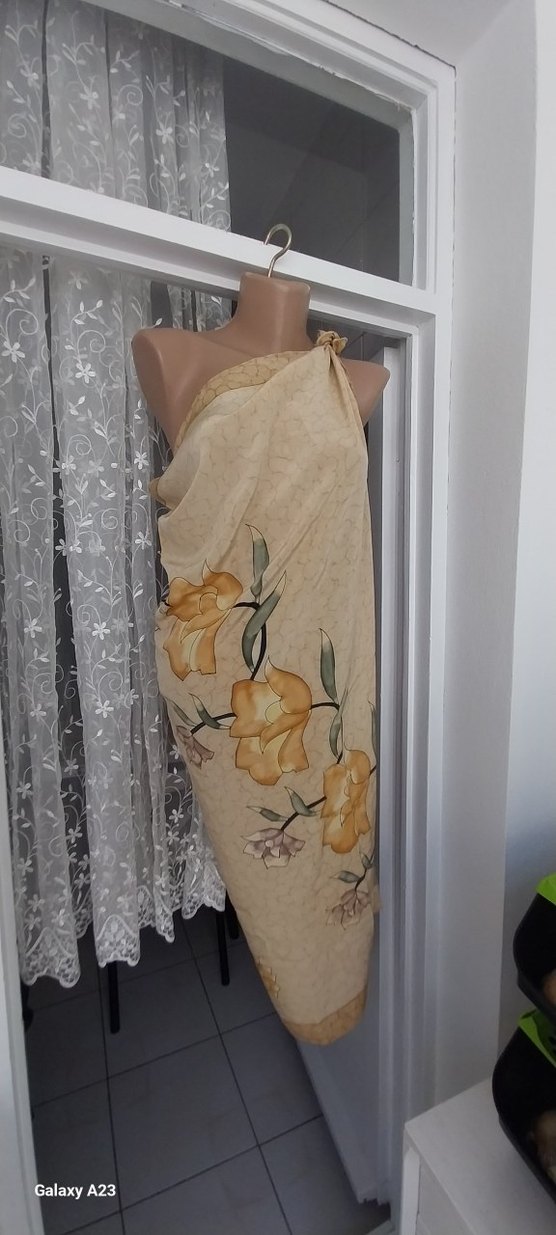 Bej renkte, çiçek desenli, kolsuz, bol kesim ve drapeli uzun pareo, bohem ve retro tarzda günlük kullanım için uygun. saf ipek belli belirsiz lekesi var o yüzden kelepir 108 x108 tam kare
