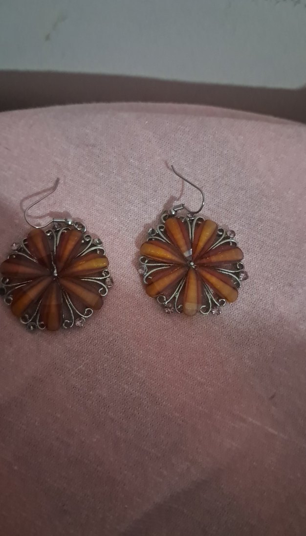 Bej tonlarda çiçek desenli boncuklu küpe, parlak vintage bohem tarzını yansıtıyor. Günlük kullanım için normal midi uzunlukta.