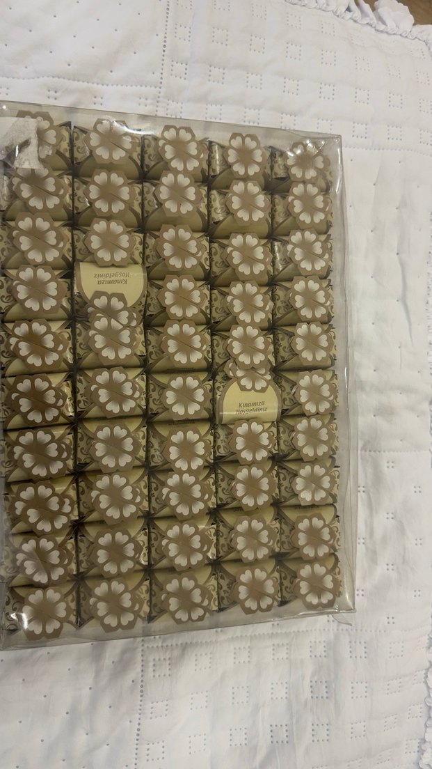 Açık bej renkte, çiçek desenli kuru kına süslü , kına geceleri için dagıtmalık kuru kına