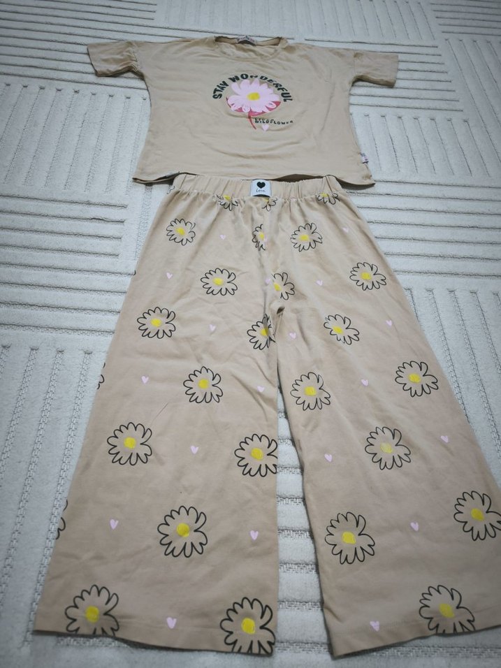 Bej renkte, kısa kollu, bol kesim kiz çocuk pijama takımı. Pantolonlar çiçek desenlidir ve rahat sokak stilini yansıtır.