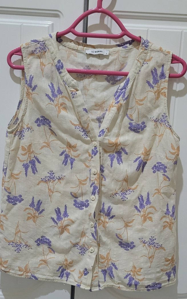 Bej Çiçek Desenli Kolsuz Keten Gömlek