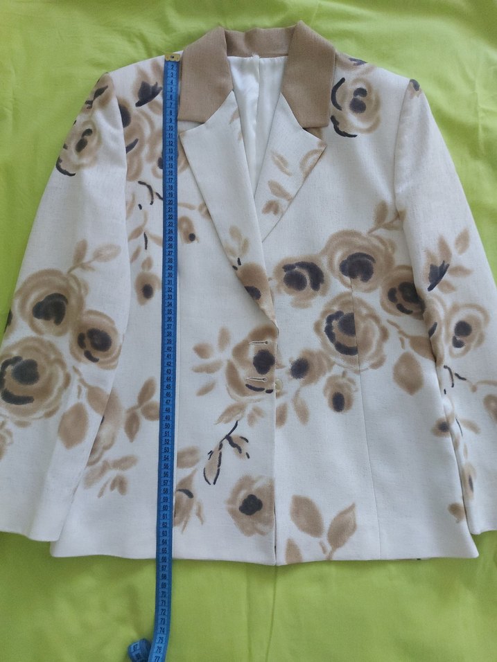 Bej renkli, çiçek desenli midi boy ceket, kesik yaka ve düğmeli. Uzun kollu, regular fit, sentetik kumaştan, vintage bohem tarzda günlük kullanım için.Tertemizdir.1 kere giyilmistir.