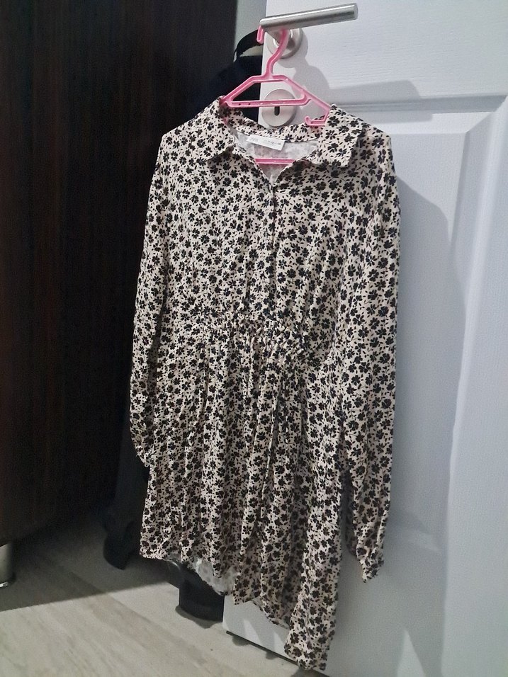 Bej renkte, gevşek kesim midi boy, uzun kollu, yakalı ve düğmeli önü olan çiçek desenli elbise. Sentetik kumaştan, günlük kullanıma uygun.