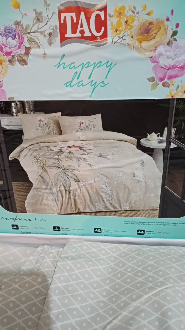 Bej renkte, pastel tonlarda çiçek desenli nevresim takımı, yumuşak dokulu kumaştan üretilmiştir. Takımda uyumlu yastık kılıfları da bulunmaktadır.