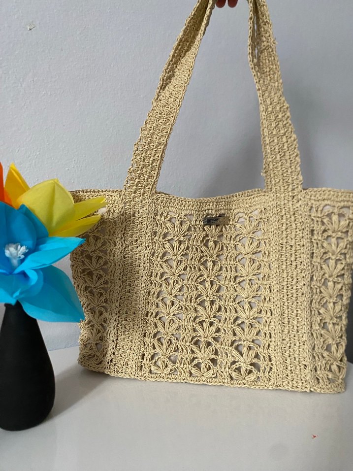 Bej Çiçek Desenli Örgü Kadın Çanta