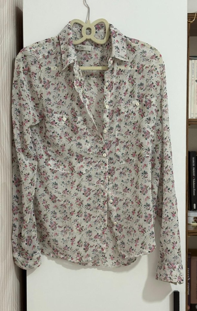 Bej pamuklu gömlek, çiçek desenli ve uzun kolludur. V yakalı, düğmeli ve bol kesimdir. Vintage bohem tarzını yansıtır, günlük kullanıma uygundur.
