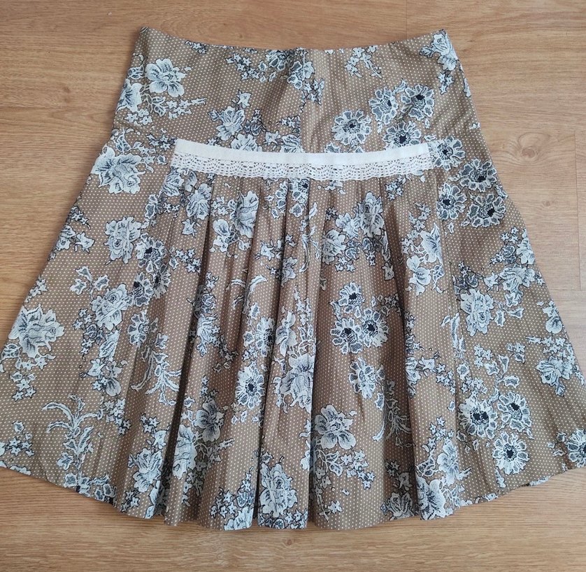 Bej Çiçek Desenli Pilili Midi Etek