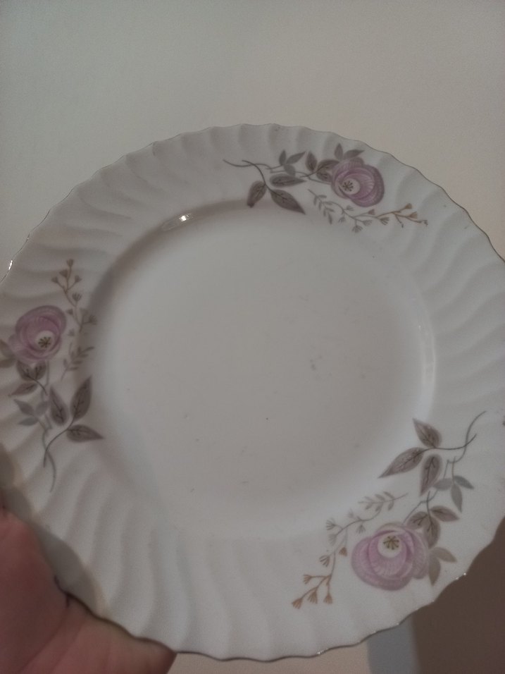Bej renkte, kenarında açık pembe ve gri çiçek desenleri bulunan porselen tabak. ️