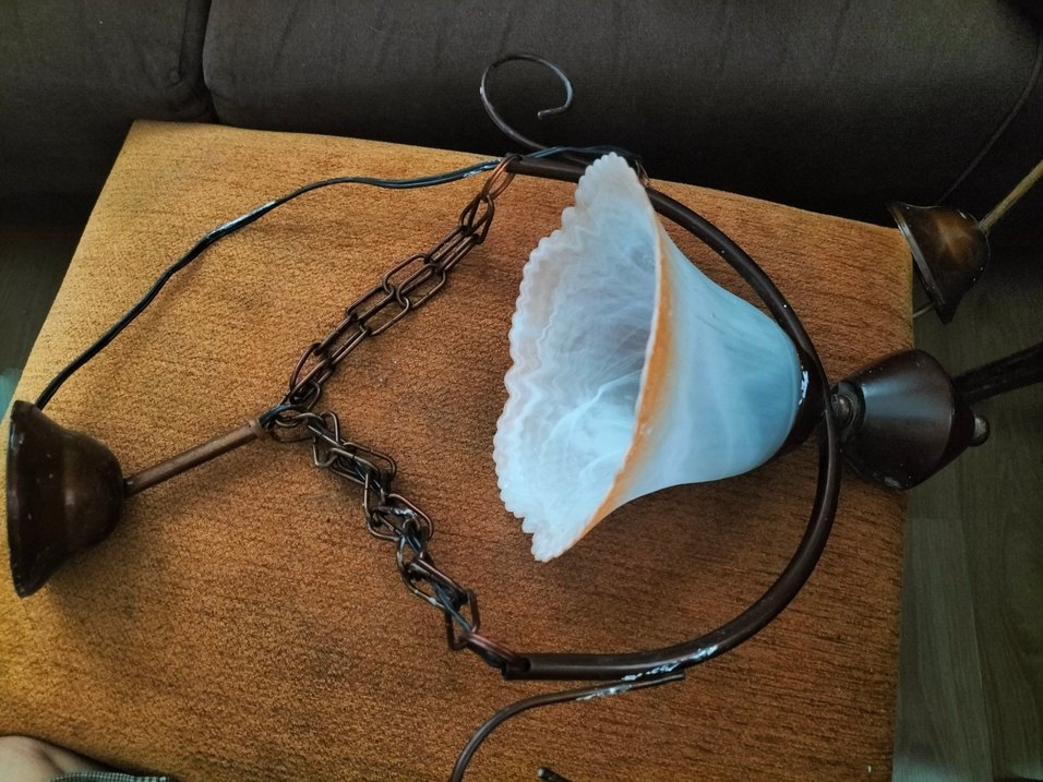 Çiçek şeklinde ışık kapağı ve metal zincirli bej sarkıt lamba. Kenarları dalgalı ve zarif tasarıma sahiptir. hepsinin fiyatidir