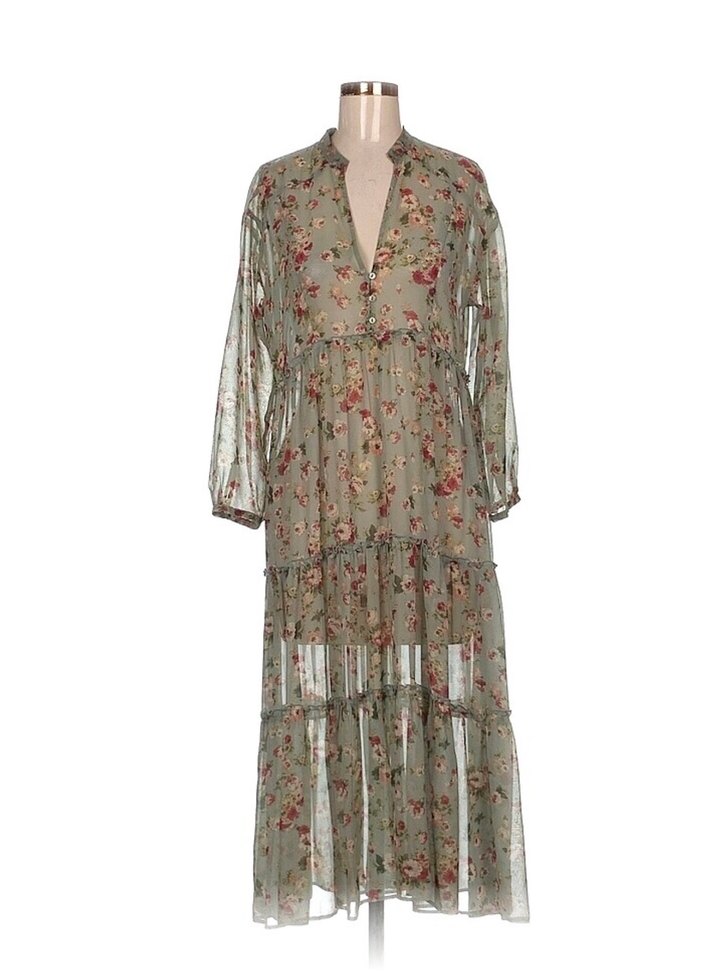 Bej renkte, V yakalı, uzun ve şeffaf kollu, çiçek desenli bol kesim bohem elbisedir. Yumuşak sentetik kumaştan üretilmiştir.