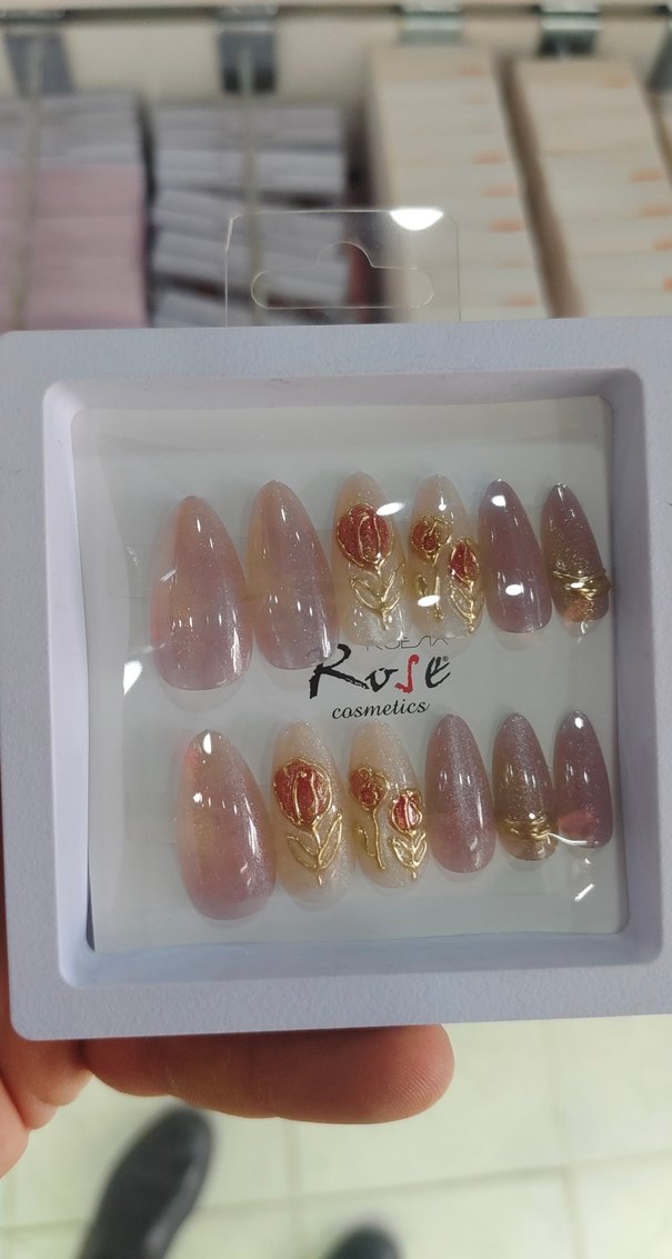 Açık bej renkli, altın detaylı zarif gül desenleri içeren takma tırnak seti.