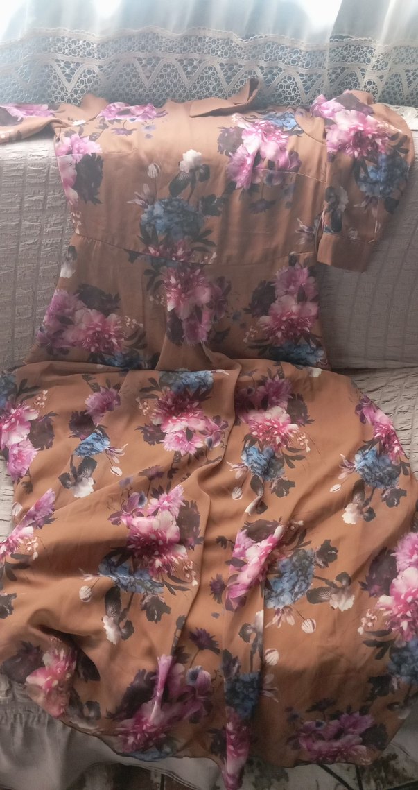 Bej renkte, çiçek desenli, kısa kollu, kayık yaka ve bol kesimli uzun bohem elbise.