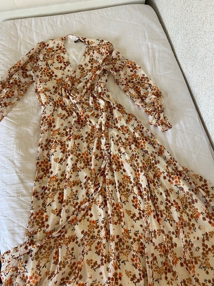 Çiçek desenli, uzun kollu, V yakalı, bol kesim ve drapeli bej uzun elbise, bohem stil için uygundur.