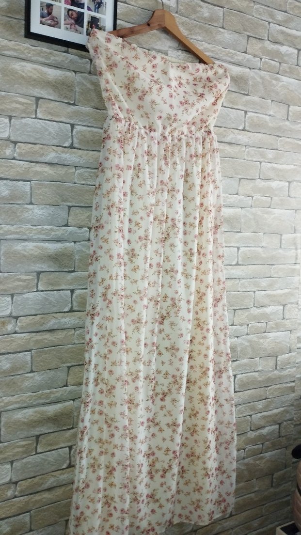 Askısız, kolsuz uzun elbise, gevşek kesim ve bej pastel çiçek deseniyle düğünler için uygun.