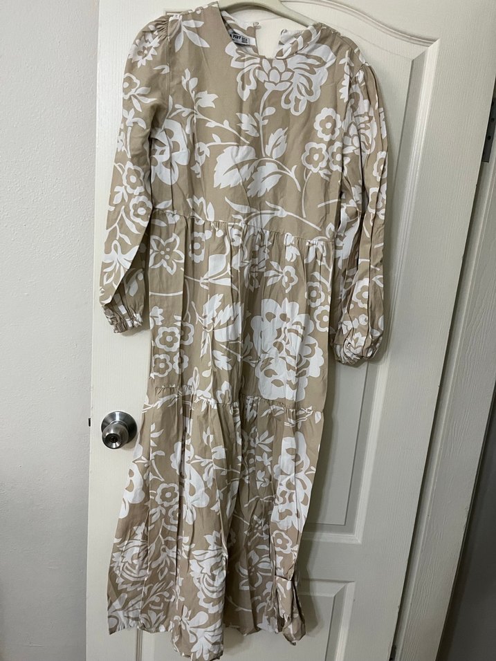 Bej keten kumaştan, gri çiçek desenli, uzun kollu, düğmeli ve bol kesim bohem tarzda elbise.