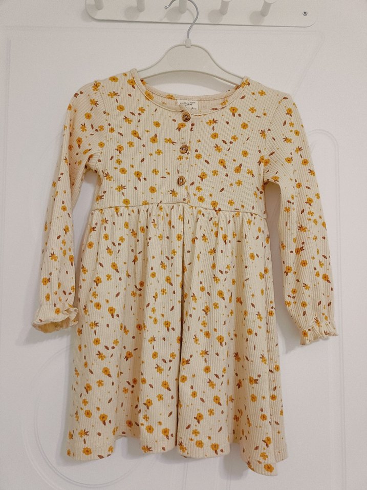 Bej Çiçek Desenli Uzun Kollu Kız Elbisesi