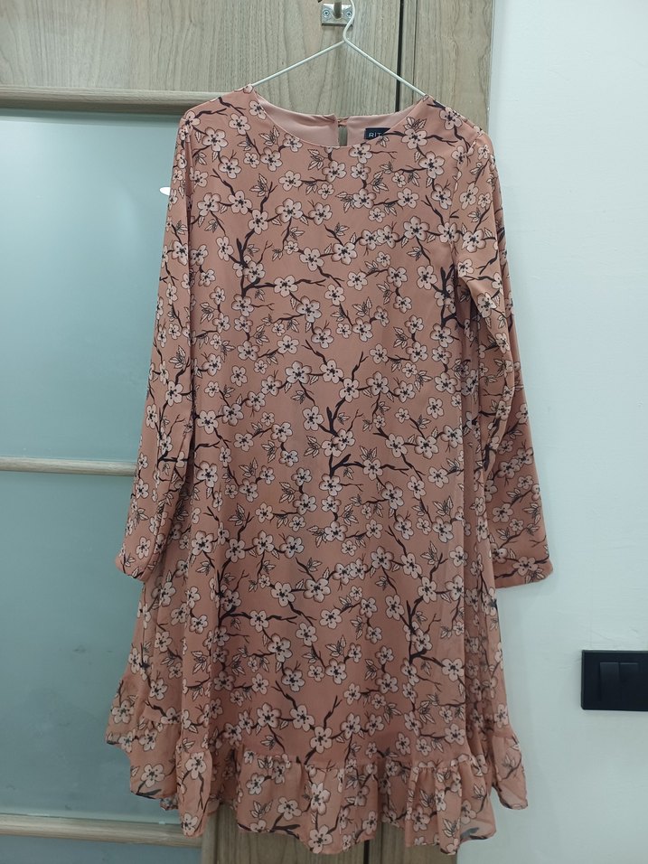 Bej Çiçek Desenli Uzun Kollu Midi Tunik Elbise
