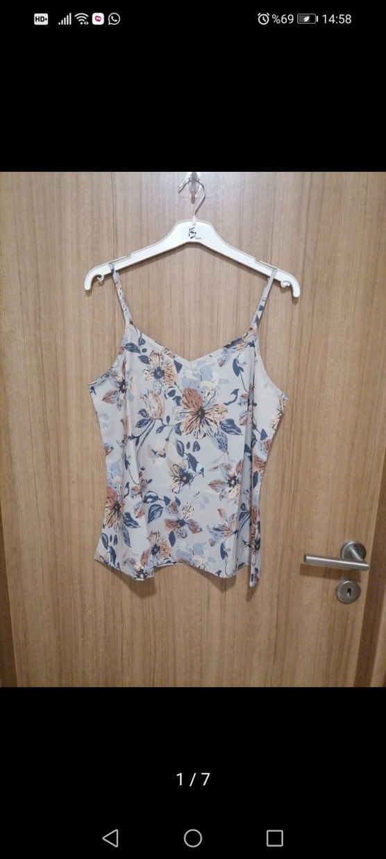 Çiçek desenli, askılı ve dökümlü bej bluz. Yumuşak sentetik kumaştan, geniş kesim ve mini boyda, günlük rahat stil için uygundur.
