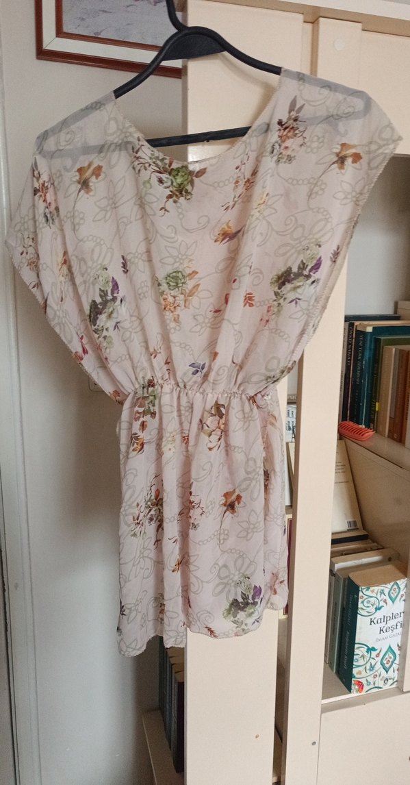 Bej renkte, çiçek desenli, V yakalı ve dökümlü bluz. Kolsuz ve bol kesim, bohem tarzına uygun.