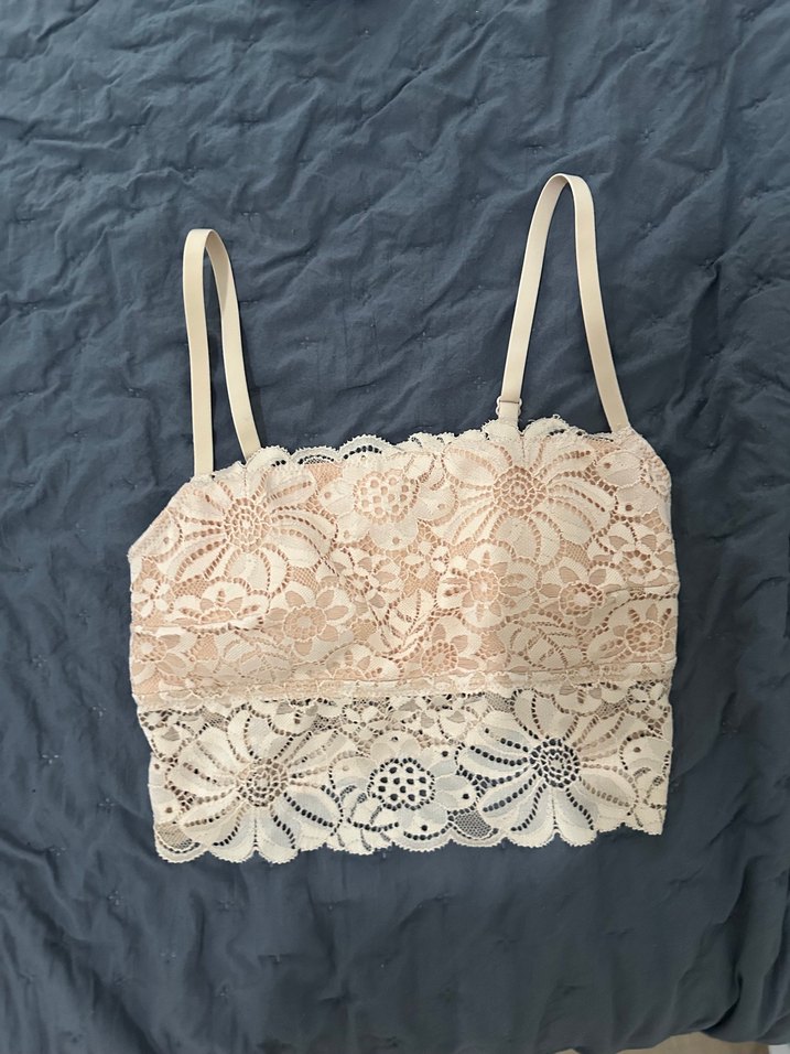 Ayarlanabilir askılı, çiçek desenli bej dantel bralet. Bohem tarzda, hafif renk ve midi uzunlukta, rahat bir his sunar.