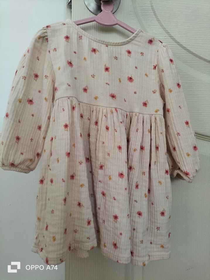 Uzun kollu, pileli keten kız çocuk elbisesi. Bej renkli, çiçek desenli ve bohem tarzda, rahat kesimle tasarlandı. hiç bir hasarı yoktur