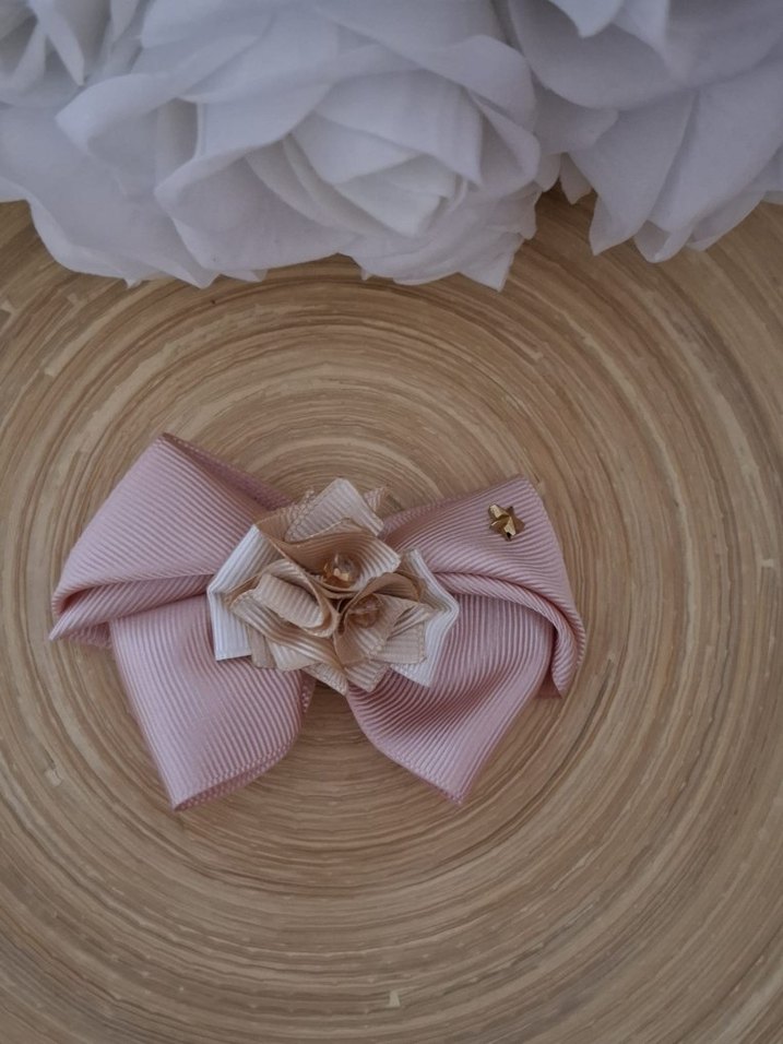 Pastel bej renkte, çiçek desenli fiyonk detaylı, modern klasik tarzda çocuk saç tokası.