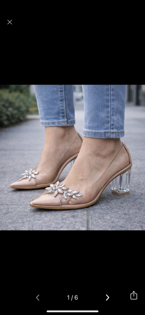 Bej renkli, parlak cam topuklu, çiçek desenli payetli kadın ayakkabısı. Günlük kullanıma uygun çağdaş tarzda.