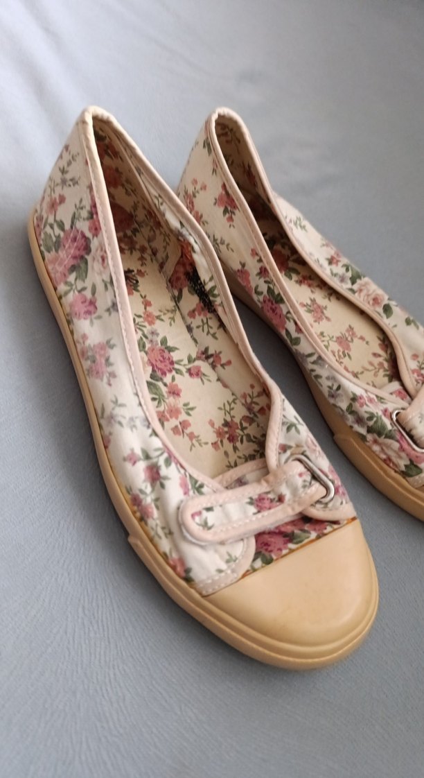 Bej renkli, pastel çiçek desenli babet. Tokalı ve lastik malzemeden yapılmış, klasik ve eski tarz görünüme sahip.